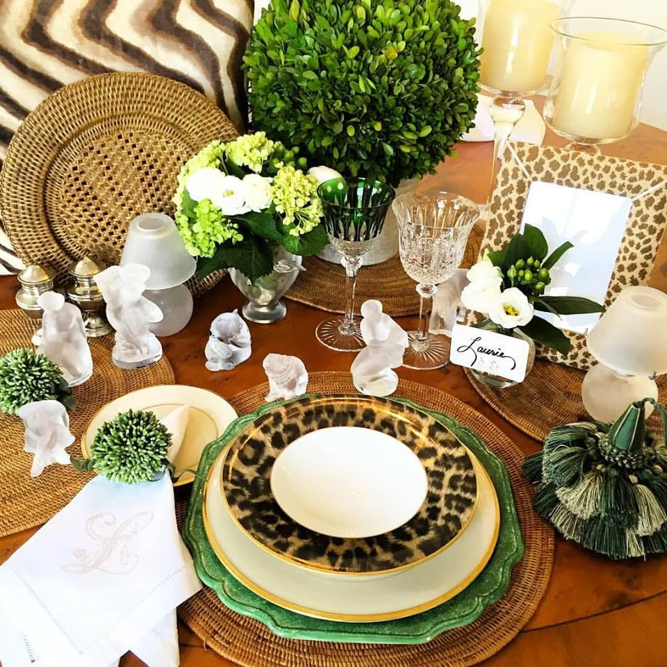 /When thinking about a tablescape, I begin by gathering colors, textures, elements and "things" I feel will measure up nicely to the level of the event. Here is an example of me "gathering nuts" for a dinner at our home I was planning for our island's 2016 Nantucket Wine Festival. I like to sleep on it. So I gather and then look at it for a day or so. I love green in spring and pulled from our collection of china, keeping it neutral and pairing it with my love of animal prints. The needlepoint frame would house the menu and each place setting would have a tiny, tea-light lamp with shade, providing the perfect glow for guests who had been wine tasting all day! I planned a small vase of flowers, also a place card holder, to be at each place setting. The flowers would be neutral and the table "art" would be our 30 year collection of Lalique figures. Collections add interest to a table and serve as a conversation piece! This dinner was to be more formal, so I thought the elegance of the Lalique would work beautifully. Don't be afraid to use your "stuff"! I'm a huge fan of boxwoods and like to incorporate them into everything. And I mean everything. These plastic boxwood napkins sent me over the moon when I found them many years ago! And the baby boxwood plants find their way onto almost all of my tables. You just have to have greenery on every table, no matter what. Chilled wine would be in straw ice buckets, because I love the juxtaposition of straw and crystal!